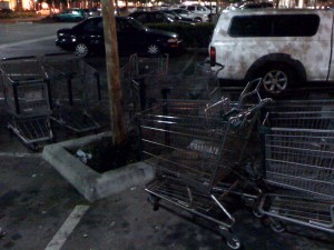 My pet peeve (and I’m an old woman with a house full of cats, when it comes to them), people who are too god-damned lazy to push them back and instead leave them at the nearest empty parking space, or worse, at the front of their own. Not a minute after getting this photo, another Asian added his to this corral. And he was smiling, the fat fuck—I should’ve taken it of him, and started a series! Granted this particular lot might be partially to blame, as their owners couldn’t or wouldn’t spare any of it for a designated return area.